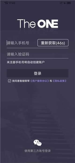 1、安裝好TheONE智能鋼琴APP后,點(diǎn)擊打開進(jìn)入應(yīng)用,第一步需要進(jìn)行注冊(cè)并登錄賬號(hào)。