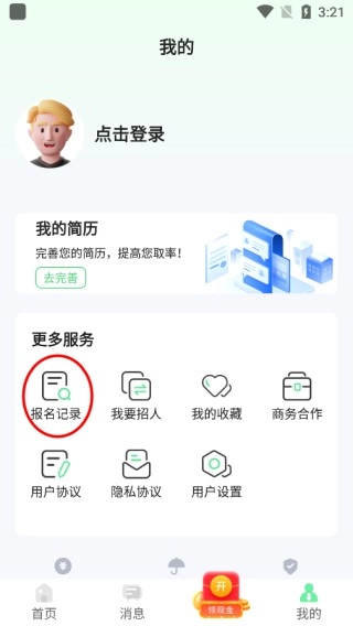 2、在我們頁(yè)面里的更多服務(wù)中找到報(bào)名記錄,點(diǎn)擊進(jìn)入。