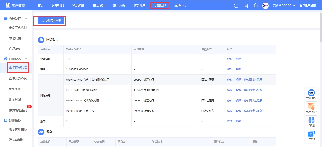 客戶管家網(wǎng)頁端的操作步驟如下:進入基礎(chǔ)信息板塊,找到打印設(shè)置,點擊電子面單菜單,然后點擊添加電子面單按鈕,選擇網(wǎng)點賬號授權(quán)的方式進行綁定。