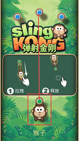 1、在【sling-KONG-彈射金剛】游戲里,操控【猴子】時,先通過“1-拉拽”動作進行蓄力,接著執(zhí)行“2-釋放”操作就能完成彈射,這是該游戲的核心玩法流程。