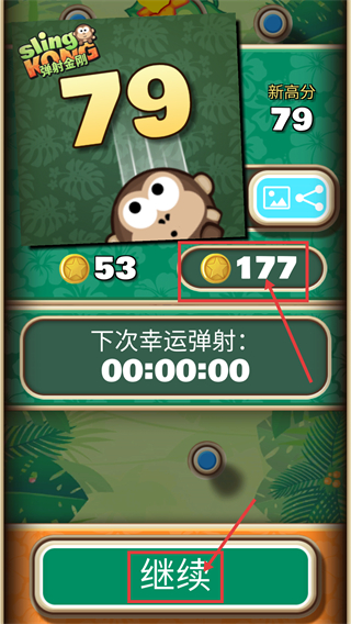 4、結(jié)算界面中獲取【177】金幣后,點擊【繼續(xù)】按鈕可開啟新一輪彈射,積累更高分數(shù)。