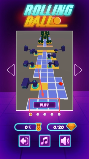 1、進(jìn)入游戲:點(diǎn)擊“PLAY”按鈕,進(jìn)入Rolling Ball的初始界面,此時(shí)界面上會(huì)顯示進(jìn)度為0%,以及0/20的數(shù)值。