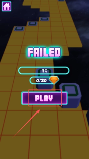 3、查看失?。寒?dāng)球掉落或超時(shí),界面顯示“FAILED 1 %”,點(diǎn)擊“PLAY”立即重試本關(guān)。