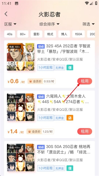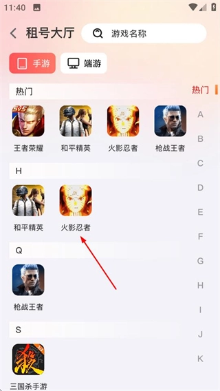 2、在租號大廳頁面,點擊火影忍者選項,進(jìn)入該游戲的租號列表頁。