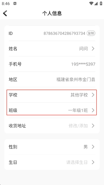 3、在此頁面可修改學(xué)校、班級,還能調(diào)整所在地區(qū)信息。
