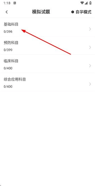 3、在基礎(chǔ)科目模擬試題列表頁面點(diǎn)擊目標(biāo)選項(xiàng),進(jìn)入該試題的題目頁面。