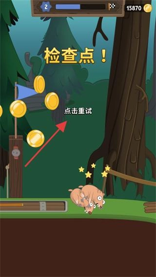 2、順利到達【檢查點!】區(qū)域,拾取這里的金幣(當前金幣數(shù)量增加到【15870】),點擊相應區(qū)域繼續(xù)朝著終點前進。