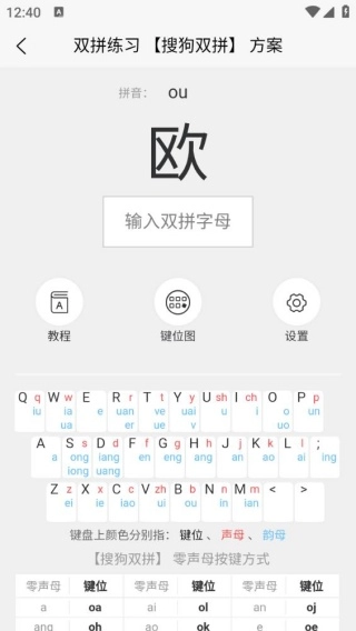 2、零聲母按鍵指南清晰呈現(xiàn),還搭配了詳細(xì)教程,能幫助用戶快速攻克雙拼學(xué)習(xí)中的難點(diǎn)。