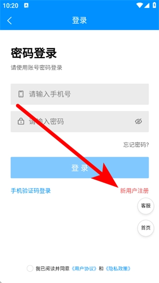 5、進入新用戶注冊界面后,依次輸入手機號與驗證碼,勾選相關(guān)協(xié)議,點擊注冊按鈕,即可完成注冊流程。