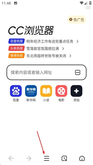 1、在CC瀏覽器首頁(yè),點(diǎn)擊底部的菜單按鈕,展開(kāi)功能菜單。