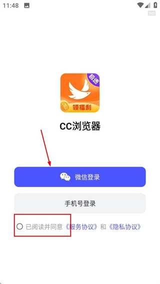 3、進(jìn)入登錄頁(yè)面后,先勾選相關(guān)協(xié)議,再選擇微信登錄方式,最后完成微信登錄的操作步驟。