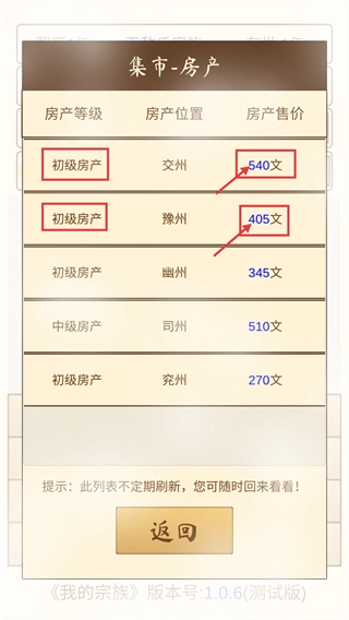 2、在【集市-房產(chǎn)】界面中,可選擇【初級(jí)房產(chǎn)】,交州售價(jià)【540文】、豫州【405文】,消耗銅錢購(gòu)置以增加宗族收入。