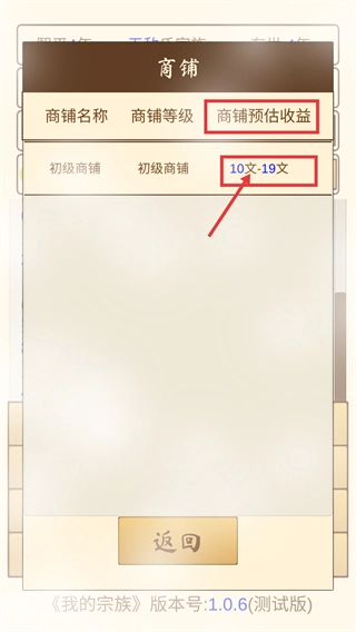 4、進(jìn)入【商鋪】界面,可查看【初級(jí)商鋪】對(duì)應(yīng)的【商鋪預(yù)估收益-10-19文】,布局商鋪提升宗族的持續(xù)收益。