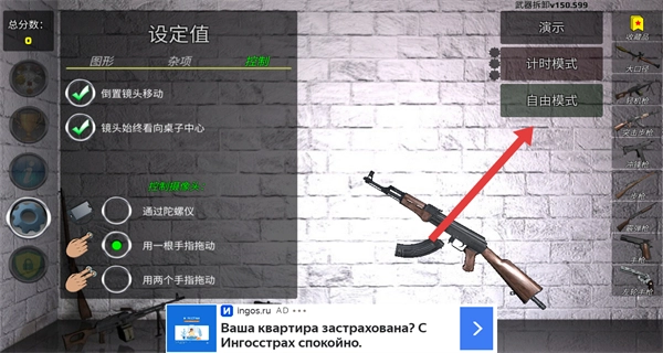 1、在設(shè)置界面確認(rèn)好控制方式后,點擊右側(cè)的自由模式按鈕,即可進(jìn)入槍械操作場景。