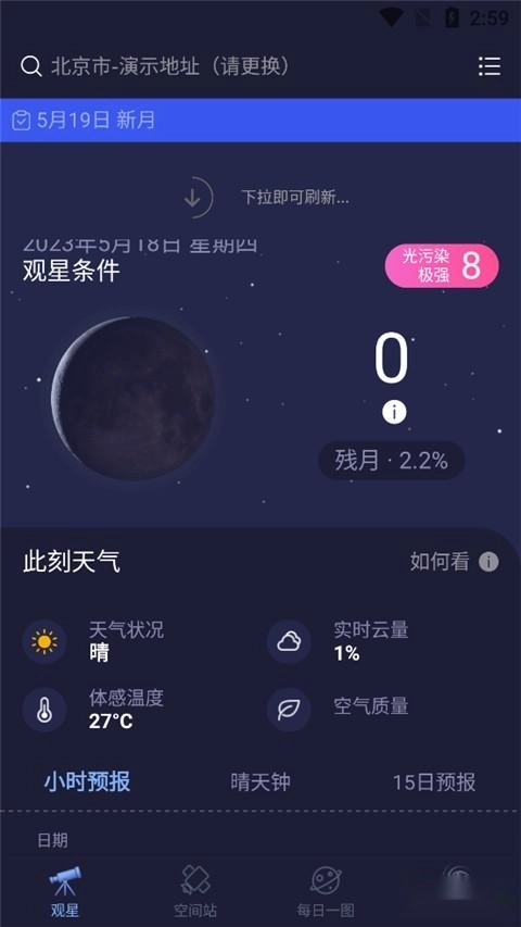 1、主界面可實時呈現(xiàn)當?shù)赜^星條件的評估情況,涵蓋光污染等級、月相狀態(tài)(精確到百分比)、最佳觀星時段等關(guān)鍵數(shù)據(jù)。借助專業(yè)算法對月相、天氣等因素進行綜合分析,為您提供個性化的觀星建議。