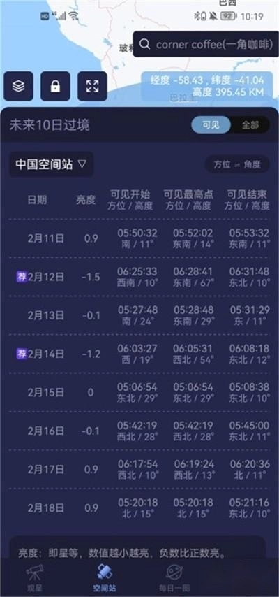 3、獨家整合中國空間站等20余顆重要人造衛(wèi)星的過境預(yù)報信息,支持用戶按需定制提醒功能。此外,還提供八大恒星的實時參數(shù)監(jiān)測服務(wù),可充分滿足專業(yè)級別的觀測需求。