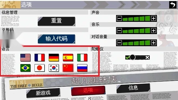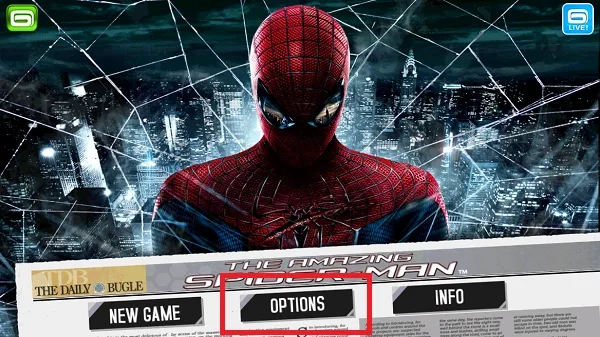 1、打開超凡蜘蛛俠手機(jī)版中文版后,點(diǎn)擊紅框內(nèi)“options”