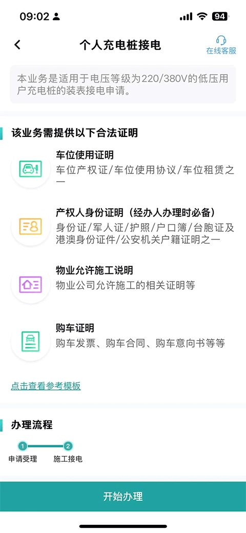 辦理此項(xiàng)業(yè)務(wù)需準(zhǔn)備車位使用證明、產(chǎn)權(quán)身份證明、物業(yè)允許施工說明及購(gòu)車證明等合法材料。若您已確認(rèn)上述證明齊全,點(diǎn)擊下方“開始辦理”按鈕即可啟動(dòng)流程。