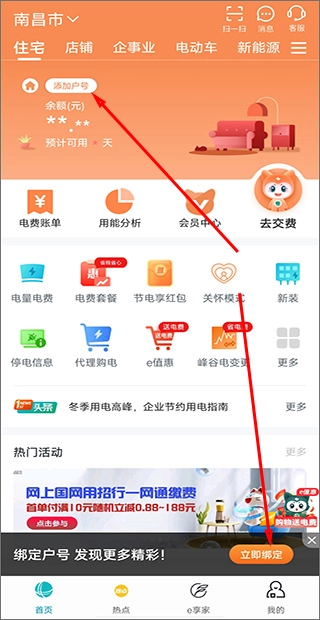 打開網(wǎng)上國(guó)網(wǎng)應(yīng)用后,在首頁(yè)找到并點(diǎn)擊“添加戶號(hào)”或者“立即綁定”按鈕。