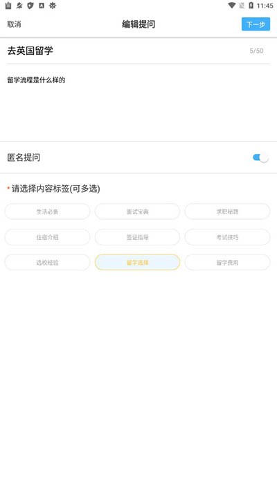 5、以【普通提問】為例,輸入問題,選擇標簽,點擊下一步