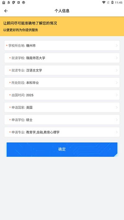 6、進入下一個頁面,用戶需要補充一些關(guān)于留學(xué)的基本信息。