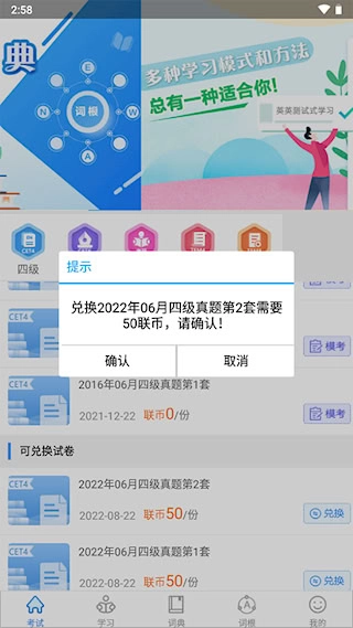 詞庫資源豐富多元:覆蓋四六級(jí)、考研、雅思、托福等三十余種考試詞庫,能滿足各類學(xué)習(xí)者的不同需求,并且支持用戶創(chuàng)建專屬的個(gè)性化詞庫。