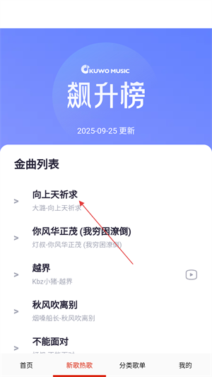 2、在新歌熱歌頁面中,點擊【酷我飆升榜】,即可進入飆升榜查看熱門上升歌曲。