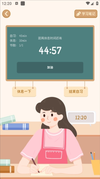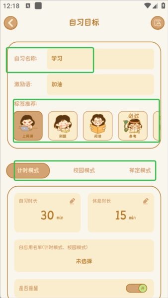 -設(shè)定自習(xí)目標(biāo),提供三種自習(xí)模式可選,支持自定義自習(xí)時(shí)長(zhǎng)與休息時(shí)長(zhǎng),還能添加激勵(lì)話語(yǔ),并選擇不同的分類標(biāo)簽。