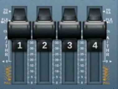 節(jié)流閥,也就是常說的油門,它發(fā)揮作用的前提是發(fā)動(dòng)機(jī)處于開啟狀態(tài)。在引擎面板上,設(shè)有四個(gè)可單獨(dú)控制引擎的節(jié)流閥;而在其他面板上,則配備了一個(gè)總節(jié)流閥,能夠?qū)崿F(xiàn)整體控制。引擎具備多個(gè)功率檔位,像toga(功率范圍450 - 420)、Flx(395 - 382)、Cl(352 - 330)、A(300 - 290)、l(275 - 260)等。其中toga檔位對(duì)引擎的損耗非常大,燃油消耗速度也極快,因此不建議全程開啟。Cl檔是巡航時(shí)的最佳選擇,F(xiàn)lx屬于減推力起飛檔位,在爬升階段使用效果也比較好。