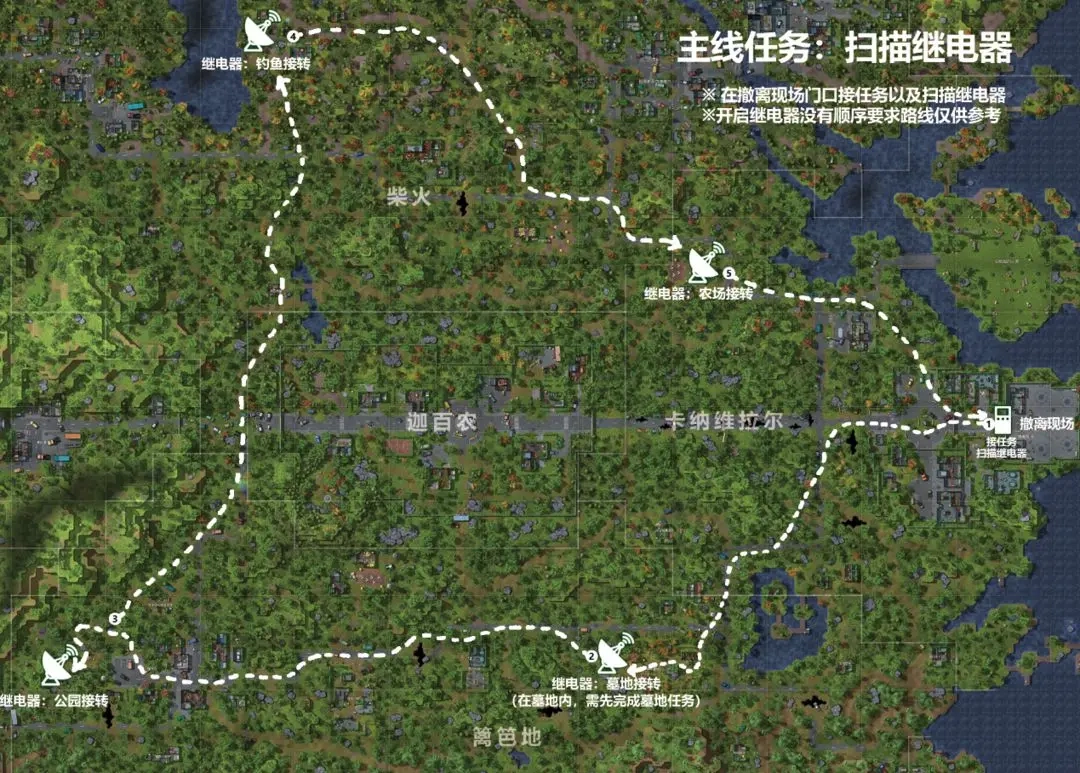 先點亮營火,接著去接撤離現(xiàn)場門口的任務——這個任務要求點亮四個繼電器,目的是讓玩家熟悉釣魚、農(nóng)場、石碑、墓地這些游戲里的重要玩法。完成后打開營火左邊的大門,往返撤離現(xiàn)場的路就順暢了。