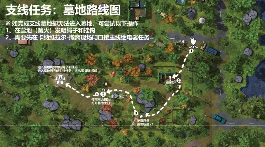 點亮營火后,去墓地入口處的小房子里接取墓地相關任務,具體流程可參考下圖。