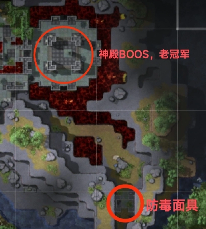 進入神殿后,需要擊敗古墓守衛(wèi)與BOSS老冠軍。建議優(yōu)先使用遠程攻擊,近戰(zhàn)若血量不足會比較棘手。戰(zhàn)勝BOSS后向下行進,即可找到防毒面具,其大致位置可參考下圖。