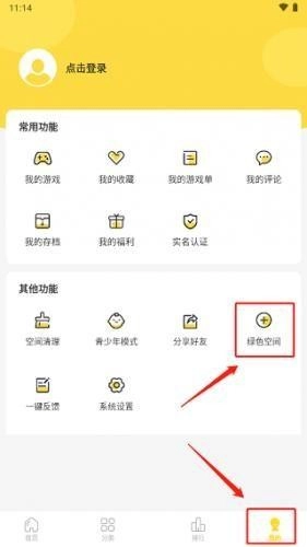 打開閃玩,在【我的】頁面點(diǎn)擊“綠色空間”。