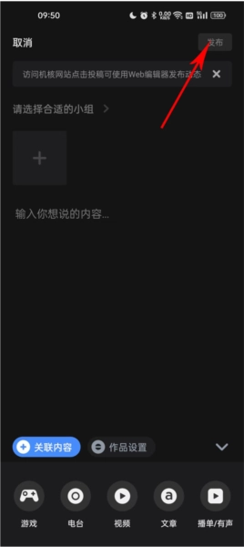進入發(fā)布內(nèi)容中心后,先填寫你想發(fā)布的話題以及相關(guān)內(nèi)容,接著選擇對應的發(fā)布類型,最后點擊右上角的“發(fā)布”按鈕即可完成操作。