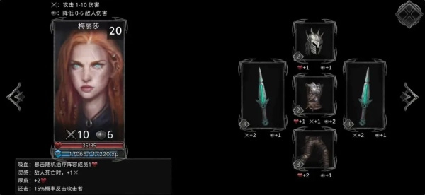 第五個盲女,身板肉,輸出能打,暴擊時可為隊友回血,培養(yǎng)方向優(yōu)先堆護甲和攻擊。