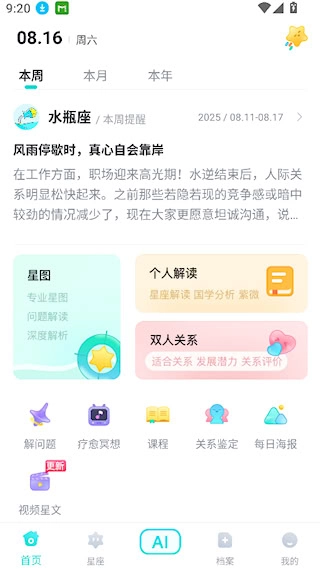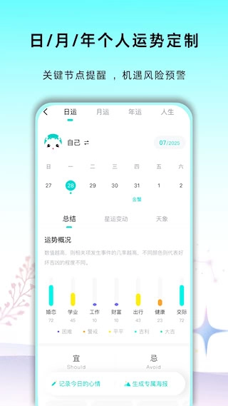 擁有專屬化的每日、每月以及全年運(yùn)勢(shì)預(yù)測(cè)能力。系統(tǒng)依據(jù)個(gè)人命盤并結(jié)合實(shí)時(shí)天象,產(chǎn)出帶有針對(duì)性的行動(dòng)提議與趨勢(shì)提示,為日常抉擇提供參考導(dǎo)向。