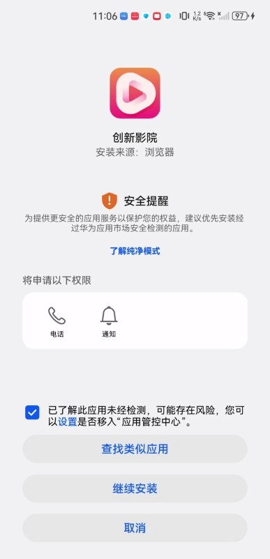 接下來請勾選“已了解此應(yīng)用未經(jīng)檢測……”這一項,然后點擊“繼續(xù)安裝”按鈕。(另外,也可以點擊查看純凈模式的相關(guān)信息)