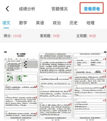 App端的考試報告包含【成績分析】、【答題情況】以及【查看原卷】這幾個部分: