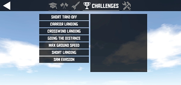 還有挑戰(zhàn)模式,包含短距起飛、艦載機(jī)著艦、側(cè)風(fēng)著陸、遠(yuǎn)航等玩法。