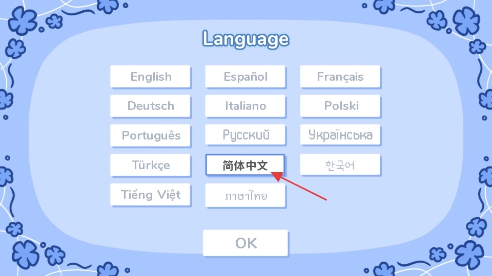 在語言選擇界面,先點擊【簡體中文】選項,接著點擊【OK】按鈕,即可將游戲語言設置為中文。