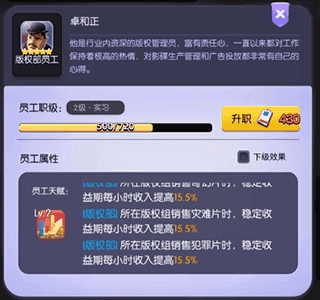 員工、編劇乃至導(dǎo)演的培養(yǎng),本就是個循序漸進的養(yǎng)成過程,這就像玩養(yǎng)成游戲,核心樂趣恰恰在于慢慢養(yǎng)成的體驗,不必急于求成。建議先從低星低配置的員工用起,后續(xù)再替換成更高配置的人員——無論是詞條加成還是初始屬性加成,提升幅度都會非常大。