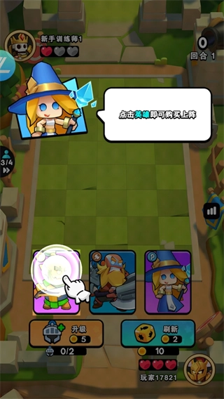 點(diǎn)擊刷新按鈕,若連續(xù)刷到三個(gè)相同的英雄并購(gòu)買(mǎi),即可將它們合成為二星英雄。