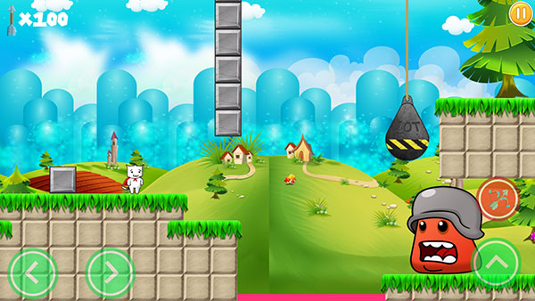 關卡由基礎地形和各類陷阱構成核心障礙?;A地形并非完全固定,部分磚塊可被撞擊破壞或隱藏通道,而陷阱呈現(xiàn)高度隨機性與迷惑性——看似安全的地面可能是突然塌陷的坑洞,普通問號方塊可能彈出致命尖刺,甚至空中飄落的云朵也可能是會移動的傷害源。陷阱觸發(fā)無明顯規(guī)律,玩家需通過反復嘗試記錄危險點,建議采用小步試探的移動方式,避免快速沖刺導致的意外死亡。
