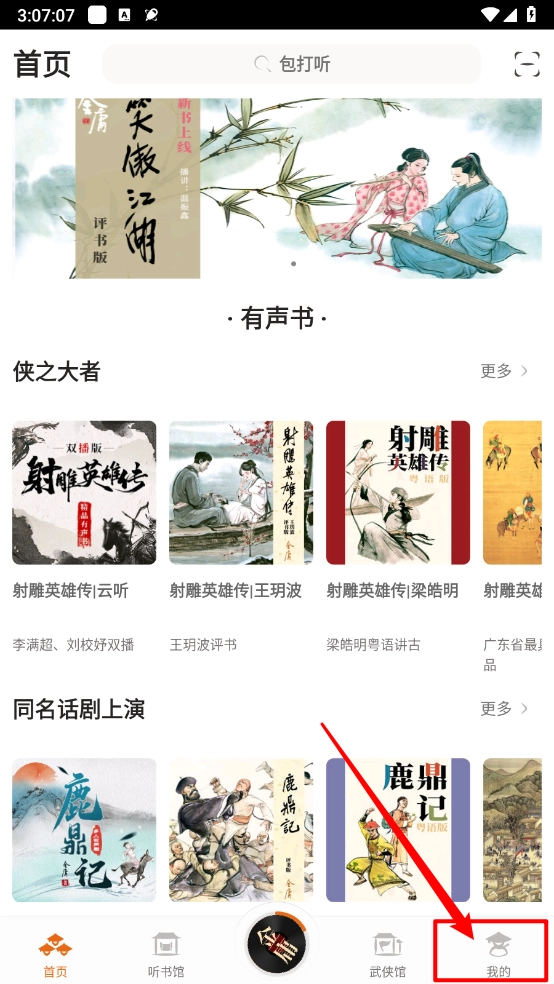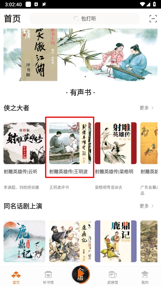 打開金庸聽書,進入首頁,滑動選擇喜歡的有聲資源。
