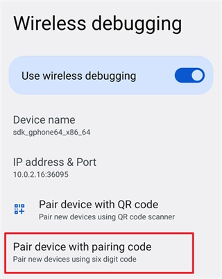 點(diǎn)按“無線調(diào)試”中的“使用配對碼配對設(shè)備”