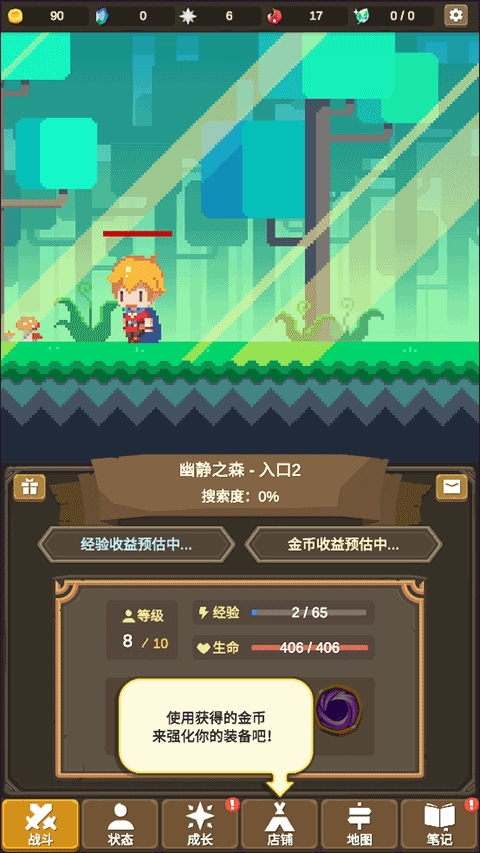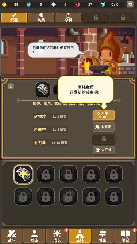 商店里打造裝備到特定等級會解鎖新裝備,前期不太容易卡關,所以不用急著重鑄裝備,能省點金幣就省點(畢竟金幣真的很緊缺);卷軸只要拿到手就趕緊學習,而且要優(yōu)先學卷軸。