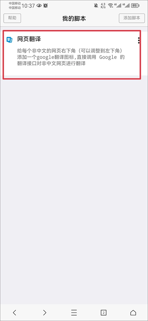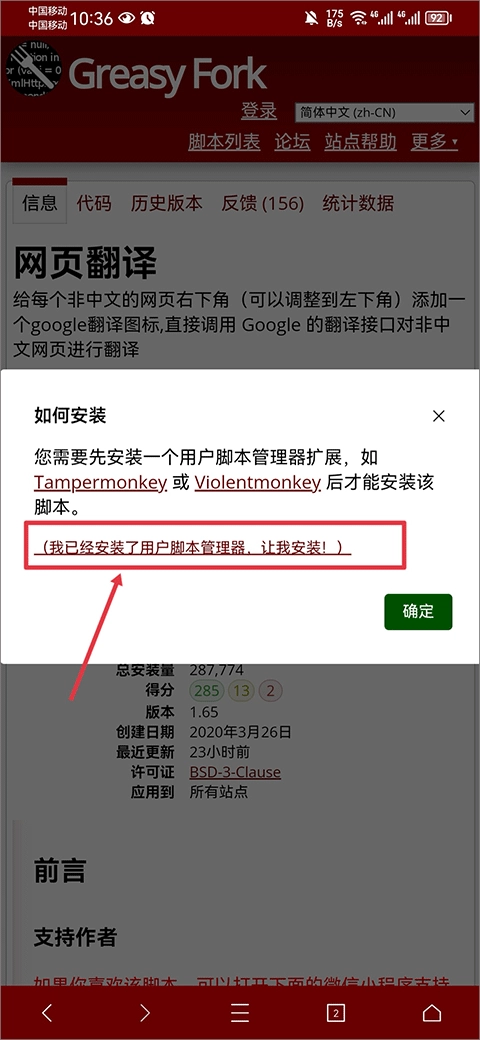 我們拿網(wǎng)頁翻譯這個(gè)腳本舉例,打開腳本詳情頁后,直接點(diǎn)擊“安裝此腳本”按鈕就行。