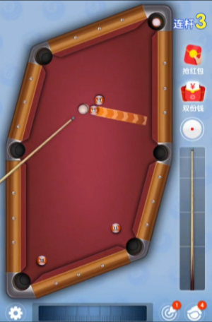 1、玩家通過拖動屏幕控制球桿方向,調(diào)整角度與力度后擊打主球,讓目標(biāo)球精準(zhǔn)落袋。