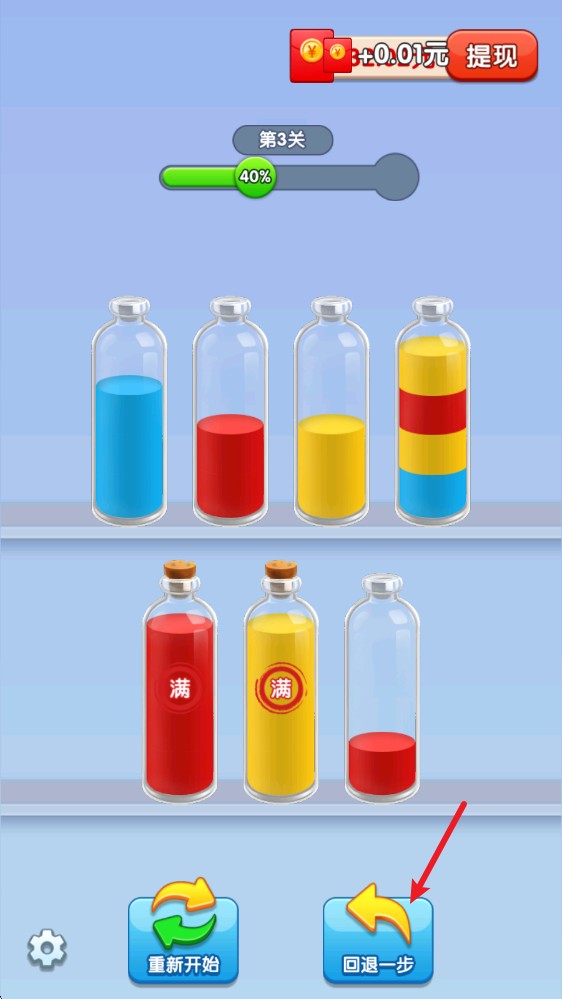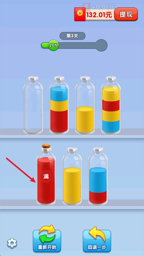 3、如果發(fā)現(xiàn)瓶子不夠用,還可以看廣告解鎖更多一個(gè)空瓶子來(lái)增加容錯(cuò)率。