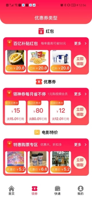 設(shè)有豐富的領(lǐng)券優(yōu)惠專區(qū),涵蓋零食、電影票、視頻會(huì)員、外賣紅包等多種福利,滿足不同消費(fèi)需求。
